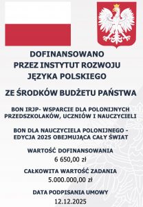 Dzięki wsparciu Fundacji „Pomoc Polakom na Wschodzie” im. Jana Olszewskiego z siedzibą w Warszawie, finansowanemu przez Instytut Rozwoju Języka Polskiego im. św. Maksymiliana Marii Kolbego ze środków budżetu państwa, 8 nauczycieli z naszej szkoły otrzymało Bon dla nauczyciela. Łączna wartość dofinansowania wyniosła 6 650,00 zł.