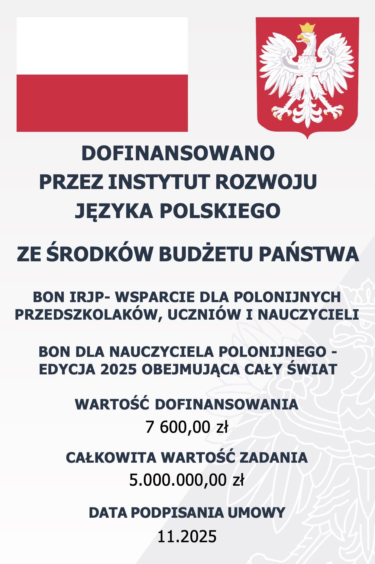 Dzięki wsparciu Fundacji „Pomoc Polakom na Wschodzie” im. Jana Olszewskiego z siedzibą w Warszawie, finansowanemu przez Instytut Rozwoju Języka Polskiego im. św. Maksymiliana Marii Kolbego ze środków budżetu państwa, 8 nauczycieli z naszej szkoły otrzymało Bon dla nauczyciela. Łączna wartość dofinansowania wyniosła 7 600,00 zł.